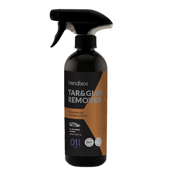 Препарат за отстраняване на катран и лепило Hendlex - безопасно отстранява остатъци от катран, асфалт, стикери и лепила без агресивни химикали или търкане. Нежен към боя, стъкло, пластмаса, гума и колела, той оставя повърхностите чисти и неповредени.